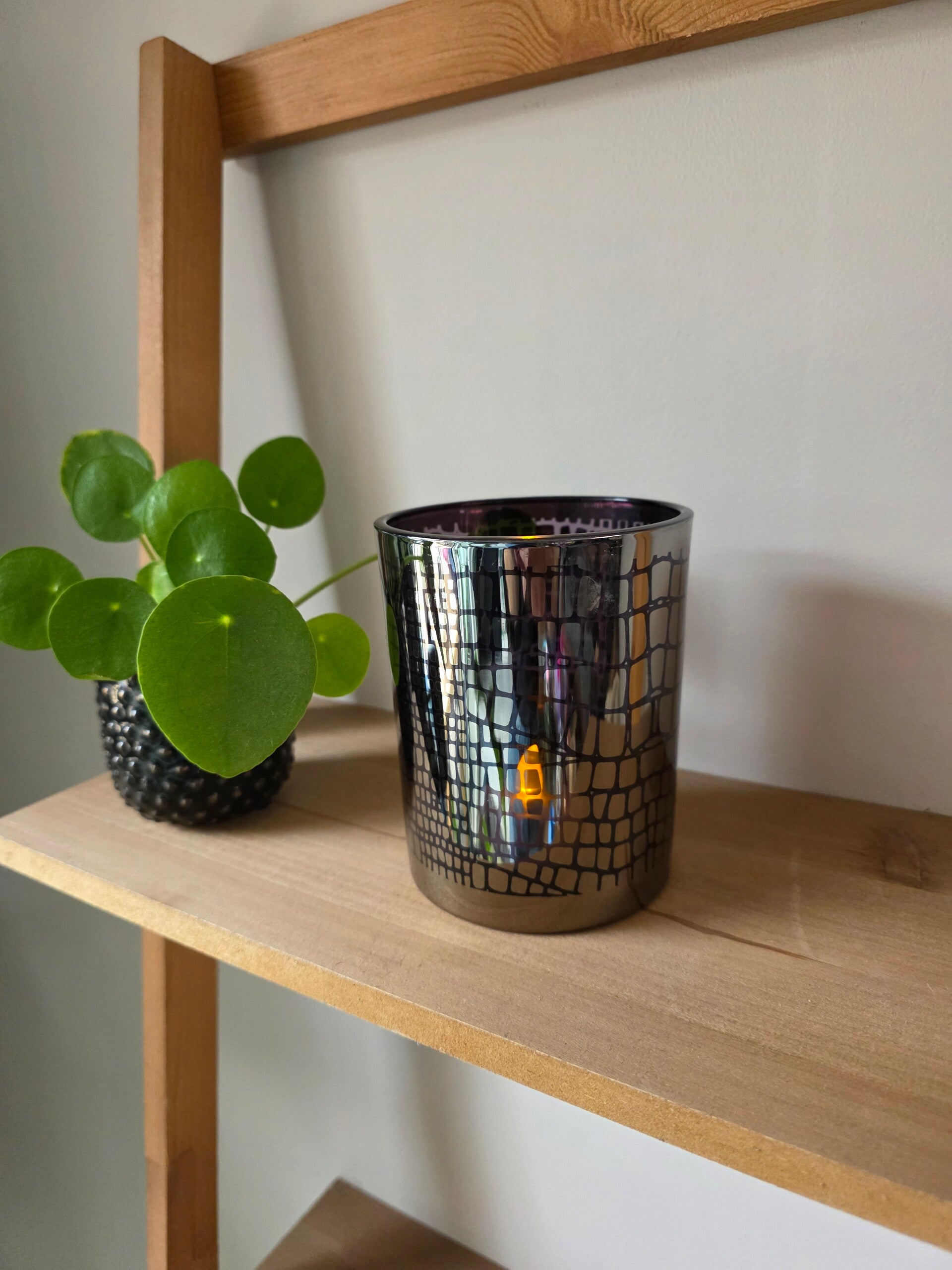 Deze theelichthouder van Mars&More is 12,5 cm hoog en heeft een diameter van 10 cm. De theelichthouder heeft een patroon dat lijkt op krokodillenhuid. Zilverkleurige