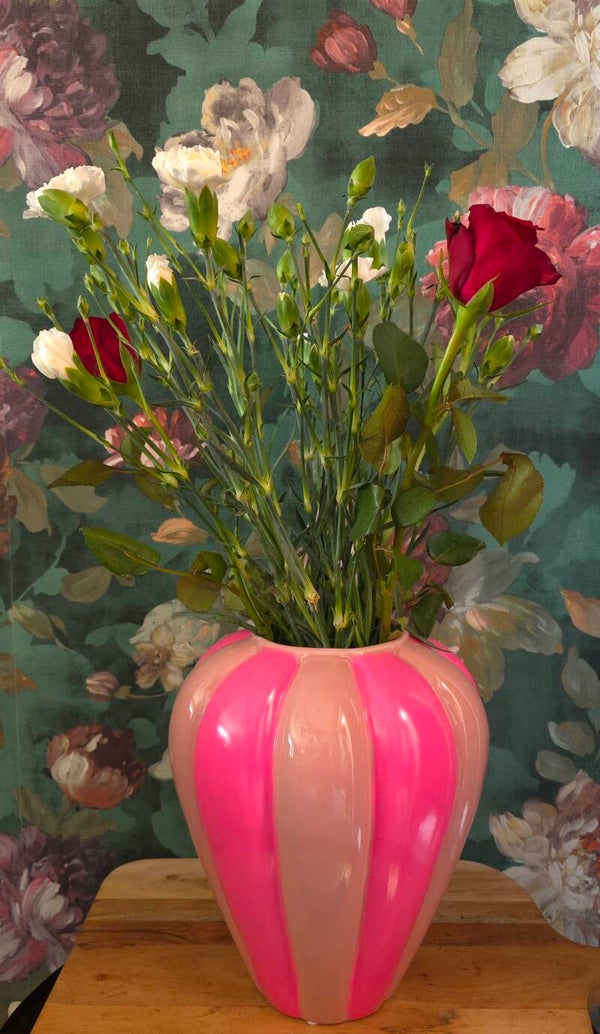 Voeg kleur en vrolijkheid toe aan je huis met de keramische swirl vaas in neonroze en lichtroze strepen van housvitamin. Het speelse swirl ontwerp en de twee tinten roze maken deze vaas een echte blikvanger, met of zonder bloemen. Een perfecte mix van trendy en speels, ideaal om je interieur een zonnige boost te geven.