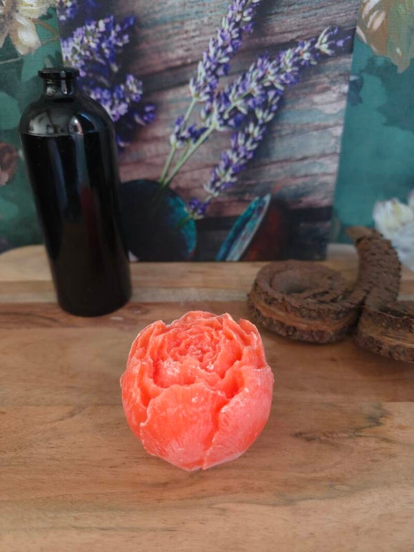 Deze prachtige amberblok in de vorm van een pioenroos heeft een heerlijk zoete fruitige geur met een mix van Mango en Perzik